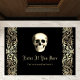 Begroet je gasten met deze spookachtige chique Halloween-deurmat! Stijlvolle Gothic Glam Gepersonaliseerde Deurmat voor uw Halloween feest. Het ontwerp is voorzien van een witte schedel met gouden ornamenten op een zwarte achtergrond met "Enter If You Dare" in typografie. lettertypen voegen een authentieke uitstraling toe aan dit Gothic Glam-ontwerp. Deze mat is klaar om te worden gepersonaliseerd met jouw naam en uw eigen aangepaste bericht. De achtergrond kleur is aan te passen.