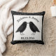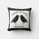 Dit geweldige dubbelzijdige bruiloft kussen beschikt over een digitale kunst afbeelding van een paar prachtige zwarte raven naar elkaar gericht en eruit zien alsof ze kussen. Ze zijn zwart met kralenogen en grijze snavels en voeten. Er zijn ook witte sterren op een zwarte achtergrond boven en onder de vogels. Er is aangepaste tekst, zodat u de namen van het gelukkige paar en de trouwdatum kunt opnemen.