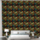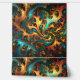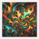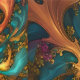 Afgebeeld in een Abstract kunstontwerp zijn gouden Blauwgroen en Oranje vlammen.
