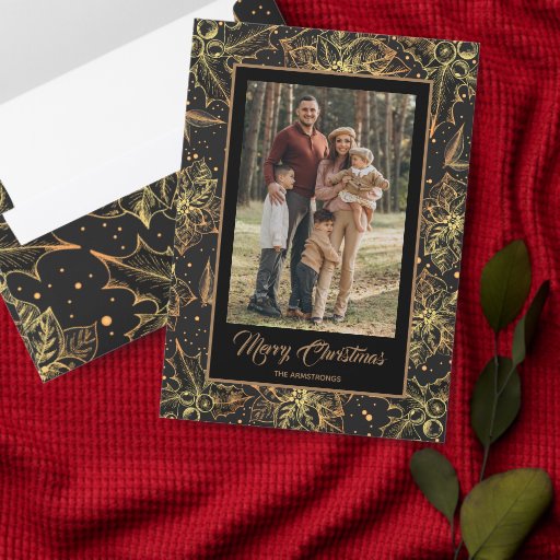 Gouden poinsettia's, hulstbladeren en bessen op een zwarte achtergrond, uw feestinformatie is te zien in chique gouden letters op deze uitnodigingen voor kerstfeestjes, perfect voor elk evenement. Overeenkomende items in ons collectie.