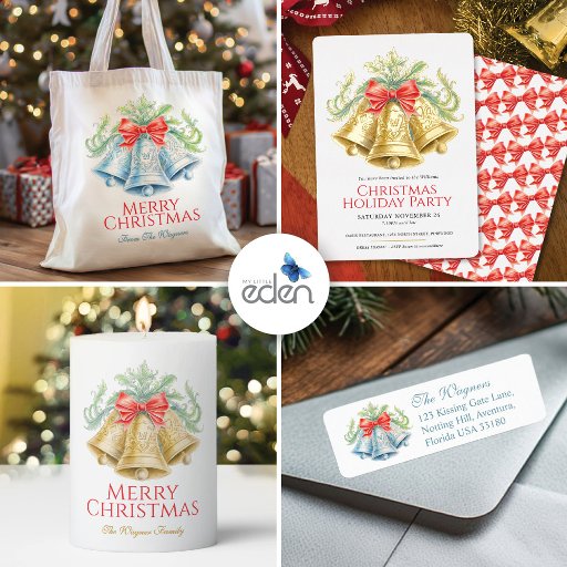 Three bells and red bow and foilage watercolor Ontworpen door Sarah Trett