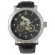 Een gouden silhouet fietser staat in het midden van dit horloge, en geplaatst op een zwarte achtergrond. Gouden cijfers rond de perimeter maken het horloge gemakkelijk af te lezen. Perfect voor elke fietsliefhebber.