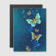 Vliegend goud, juwelen vlinder op blauwe textuur achtergrond. Ontwerp met vlinders.
