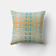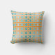 Deze werpkussens hebben een geometrisch ontwerp van lijnen in tinten van blauwgroen en oranje geweven om een vlecht te maken.