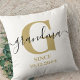 Gepersonaliseerde kussen voor een nieuwe oma of een langlopende gran, die je kunt aanpassen met de datum waarop ze grootmoeder werden. Dit trendy minimalistische ontwerp heeft een subtiel kleurenpalet van ochregeel, zwart en wit. Het heeft een oma-monogram, met de letter G van het initiaal en de naam oma, geschreven in moderne typografie en elegant handgeschreven script. Onder het monogram leest het "sinds [date]"en u kunt de datum of de verandering sindsdien uitgeven aan EST. als u verkiest. Blader alsjeblieft naar mijn winkel voor het coördineren van design.