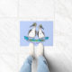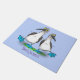 Grappig, gelukkig blauw gefundeerde cartoon die op deurmat