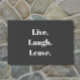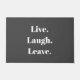 Tot slot, een inspirerend gezegde voor de introverte onder ons. "Leef. Lach. Vertrek." verkondigt deze humoristische deurmat, voor introverte, asociale en sociaal onhandige mensen die gasten ontvangen met een beetje tegenzin en misschien zelfs wel enige angst. Eenvoudige, moderne witte typografie op een klassieke houtskoolgrijze achtergrond. Onverwacht, eigenzinnig en een beetje sarcastisch, deze grappige deurmat is perfect voor diegenen die donkere, droge humor waarderen en niet bang zijn om het te delen met hun bezoekers (die ze hopelijk snel zullen verlaten).