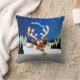 Een grappige cartoon-rendier met een heldere rode neus en grote witte gewei, versierd met een rode en gouden strik, gluurt door een open raam. Buiten is een besneeuwd landschap met gesilhouetteerde pijnbomen en een klein, gloeiend huis zichtbaar onder een donkerblauwe, met sterren gevulde nachthemel. Santa's slee, getrokken door rendieren, vliegt in de verte. De scène roept een sfeervolle en speelse kerstsfeer op. Originele Vector Art Copyright BluedarkArt TheChameleonArt.