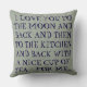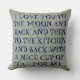Een grappig ontwerp op basis van harten en tekst, bedoeld voor een homostel. Het kussen is bedekt met geschetste harten blauw gekleurd, en een grotere set van twee blauwe harten is gecentreerd. Een enorme tekst is geschreven in speels lettertype: "Ik hou van je naar de maan en terug en dan naar de keuken en terug met een mooie kop thee - voor mij...". Een lieve en grappige quote die gemakkelijk kan worden aangepast. Vervang "thee" door "koffie" als dat uw... eh, kopje thee is. De effen blauwe achtergrondkleur kan ook worden aangepast. Als u een donkere achtergrond kiest, moet de tekst mogelijk een lichtere lettertypekleur hebben.
