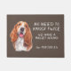 "We hoeven niet twee keer te kloppen, we hebben een Basset Hound" verklaart deze schattige deurmat. De tekst is in het wit aan de rechterkant, terwijl een schattig afbeelding van een bruin-witte bassistenhond aan de linkerkant staat. Alles is geplaatst op een grijsbruine achtergrond.