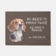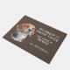 "We hoeven niet twee keer te kloppen, we hebben een Beagle" verklaart deze schattige deurmat. De tekst is in het wit aan de rechterkant, terwijl een schattig afbeelding van een bruine, zwarte en witte beagle aan de linkerkant staat. Alles is geplaatst op een grijsbruine achtergrond.