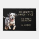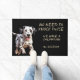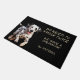 "We hoeven niet twee keer te kloppen, we hebben een Dalmatiër" verklaart deze grappige deurmat. De tekst is in bord geelbruin aan de rechterkant, terwijl een afbeelding van een schattige Dalmatische hond aan de linkerkant staat. Alles is op een zwarte achtergrond geplaatst.