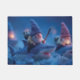 Een charmant en fantasierijk afbeelding van een groep grillige kabouters, gekleed in klassieke puntige petten, rijdend op de rug van haaien. De haaien lijken te zijn gemaakt van een sprankelende, sneeuw-achtige substantie, toe te voegen aan het magische gevoel. De scène speelt zich af in een donkere, koude en mysterieuze blauwkleurige omgeving met gloeiende lichten op de achtergrond.