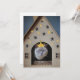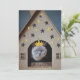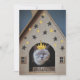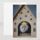 Aan de achterkant blanco voor je eigen boodschap, deze platte wenskaart heeft een afbeelding van een serieuze kat die een grillige kroon draagt terwijl hij naar buiten kijkt vanuit een huis versierd met sterren.