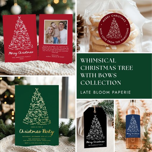 Stuur feestelijke feestelijke feestvreugde met deze kerstfotokaart met een grillige handgetekende boom van bogen op een gedurfde rode achtergrond. "Merry Christmas" wordt weergegeven in een speels script, met personalisatie voor uw familienaam en jaar. De achterkant markeert een vierkante foto met uw vakantiebericht hieronder, waardoor een vreugdevolle en persoonlijke manier ontstaat om groeten te delen.