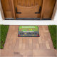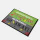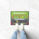 Grappige deurmat heeft twee berichten: Levering Mensen We Love You met harten en bloemen, en Sales People Go Away met enge waarschuwingspictogrammen.