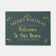 Feestelijke kerstdeurmat met gouden maretak op een diep blauwgroen groen. Voeg je eigen grappige slogan en familienaam toe, ik zei Merry Kissmas!