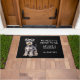 "We hoeven niet twee keer te kloppen, we hebben een Schnauzer" verklaart deze grappige deurmat. De tekst is in het wit aan de rechterkant, terwijl een afbeelding van een schattige grijze Schnauzer Terriër hond links staat. Alles is op een zwarte achtergrond geplaatst.