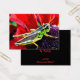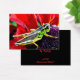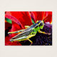 Deze briljant gekleurde Artist Trading Kaart heeft een glanzende groene, gele en zwarte sprinkhaan op het paarse midden van een bloemetje met prachtige rode bloemblaadjes.