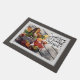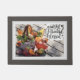 Inspirerend herfst doormat toont een mand omringd door kleurrijke herfstbronnen en gele bladeren op een lichtgrijze houten vloer. Het kenmerkt de bemoedigende woorden: "Grateful Thankful Blessed."