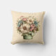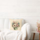 Kussen met een leuke afbeelding. Blauwe, roze en crèmekleurige bloemen met groene bladeren. Geplaatst in een groene bloempot met een groene geruite doek die over de rand hangt.