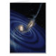 Het samenvouwen sterrenstelsels geven zwaartekrachtgolven uit, die ook wel rimpels in de ruimte-tijd worden genoemd. Hoewel men verondersteld wordt te bestaan, is de directe opsporing nog niet voorgekomen. Dit afbeelding is een aanpassing van een digitale illustratie gemaakt voor het tijdschrift Natuur.