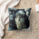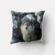 Dit wolf afbeelding is van een grijze wolf die uit een sneeuwbedekte tuin kijkt. De sneeuw balanceert op de takken terwijl deze grijze lange wolf het landschap bestudeert.