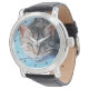 Het plaatje op deze fijne kunstpolshorloge is een origineel oliefilter "Cattitude" van de winnende kunstenaar Debra Mickelson. Het afbeelding is een portret van een mooie grijze tafelkat met gele groene ogen. Rond de omtrek van het horlogegezicht zijn kleine zwarte kattenpoten die vijf minuten tussenpozen van tijd segmenteren. De kattenpoten afbeeldingen zijn aanpasbaar, zodat als u hen zou verkiezen te schrappen, kunt u dit doen door het gebied uit te wissen.