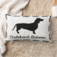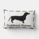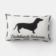 Dachshund hondenkussen met de woorden "Dachshunds Welcome" in zwart script boven wit. De randen van de kussen hebben een grijs en wit gestreept ontwerp.