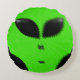 Groene Alien Head Round Pillow. Koel een groene buitenaardse kussen met een groene, aangelapte buitenaardse kop met twee zwarte ogen, twee stippen neusgaten en een gestripte mond aan beide zijden. Een groot neongroen buitenaardse kussen cadeau voor een buitenwereld van de UFO en zone 51 buitenaardse buitenaardse bezoeker op het verjaardagsfeestje!