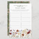 Green Boho noemt het spel Baby. Daag je gasten uit met deze Name That Baby Game, een leuke en boeiende activiteit voor je baby shower. De voorkant is voorzien van een elegant salie groen script, begeleidende spelers om babynamen te matchen met hun beroemde ouders of complete klassieke kinderrijmpjes. De achterkant is versierd met een coördinerend patroon van boho-vlinders, wilde bloemen, gedroogde grassen en zacht saliegroen gebladerte op een saliegroene achtergrond, wat zorgt voor een gepolijste en stijlvolle look. De warme aardse tinten van bruin, bruin, roest, terracotta, verbrand sinaasappel en gedempt saliegroen maken dit spel ideaal voor elk voorjaar, zomer, herfst of winter baby shower. Of gasten nu trivia pro's zijn of gewoon voor de lol, dit prachtig ontworpen spel zal zeker vreugde en vriendelijke concurrentie brengen voor uw feest!