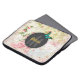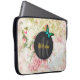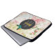 Een laptophoes met een naam en een initiaal van een monogram. Ontworpen met een elegante groene vlinder. Een zwart cirkelvormig lijst in het midden lag boven een collage patroon met roze rozekleurige rozen en groene goudbladeren met een ouderwetse blik.