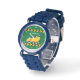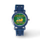Cool custom constructie voertuig kinder horloge voor een kind dat houdt van gele dump trucks in het groen. Leuk autocadeau voor een kleine jongen die van auto's en vrachtwagens houdt. Pas het aan met de naam van uw kind onder de zwarte en gele waarschuwingstape voor een peuter.