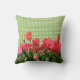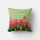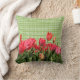 Rode tulpen bloeien tegen de achtergrond van groene gingham cheques.