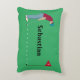 Gepersonaliseerde heldere groene golfer, met een pet, rood shirt en blauwe broek, die een golfbal in een gatvormige ontwerpkussen plaatst. Pas de tekst aan.