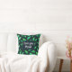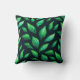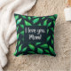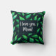 Liefde mam Moederdag kussen met een donkerbotanisch patroon gemaakt van een gemengde media-inkt en digitaal schilderen van abstracte groene bladeren met lichtgroene aders boven donkergroen, bijna zwart, achtergrond. Deze luidop voor natuur minnaar bevat de aanpasbare tekst "Ik hou van je, mam".