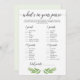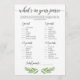Op zoek naar een leuk spel om op je vrijgezellenfeest te spelen? Doe een paarse inval met deze prachtige greenery "What's In Your Purse" gamekaarten! Laat uw gasten door hun portemonnee kijken en zien of kunnen zij om het even welke punten vinden die de lijsten op de kaarten aanpassen. De persoon met de hoogste score wint.