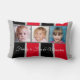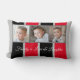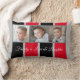 Cadeauidee, foto-collage kussen. Voeg uw eigen foto's aan dit Sierkussen, Lumbar Pillow, kussen toe en verander de tekst als u verkiest. Zes foto's staan op deze kussen, drie aan de voorkant en nog drie aan de achterkant. Familie is liefde en lachen. Familie is leuk en herinneringen. Grijs, zwart en rood met strepen en witte tekst.