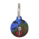 Dit label voor het identificeren van huisdieren heeft een grimmig reaper-skelet in een rode cape met capuchon die staat bij een houten hek met een spookhuis en grafstenen op een heuvel achter hem met vleermuizen die overvliegen in een diepblauwe nachtelijke hemel. Pas de naam van uw huisdier en uw telefoonnummer op de achterkant aan met de sjabloon.