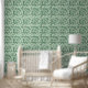 Deze peal-and-stick vinyl behang is voorzien van een gebladerte ontwerp genaamd False Indigo door de maker. Het is echter slechts een product van de verbeelding van de artiesten en lijkt niet op een vals indigo-plant. De kleuren zijn groen en crème. Gebruik het in elke kamer. Oregon Tegel maker Fay Jones Day