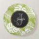 Een ronde kussen met een herhalend patroon van grote palmbladeren op een olijfgroene achtergrond. Heerlijk modern en tropisch. Een zwarte cirkel met een gouden rand bovenaan met persoonlijke details binnenin.