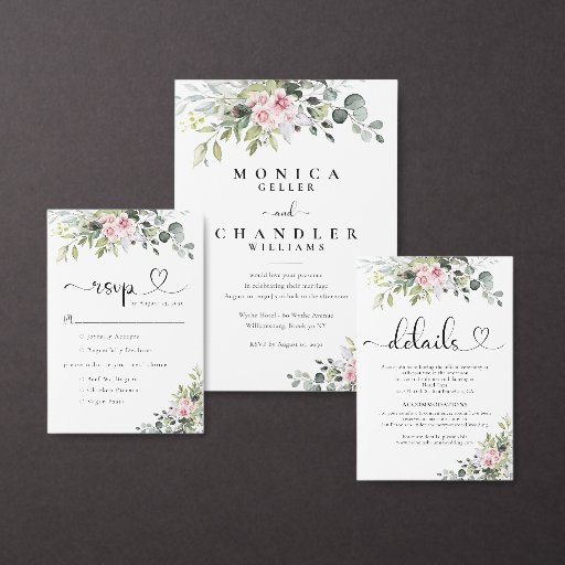 Groen Roze Roze Bruiloft Uitnodiging. Deze stijlvolle en elegante bruiloft uitnodiging beschikt over prachtige handgeschilderde waterverf eucalyptus bloemengroen Pink Rose. Vind overeenkomende items in het Greenery Pink Rose Collectie.