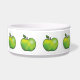 Destei's cartoon illustreert een groene appelvrucht met een klein blad aan de stengel. Het ontwerp wordt zo geplaatst dat het rond de kom gaat. Het ontwerp van de klap voor een huisdier genoemd "Apple", bijvoorbeeld.