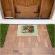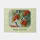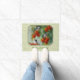 Vogels in de appelboomgaard tijdens de herfstoogst. Twee zwarte kadebaarzen in een appelboom, terwijl een derde cichorei op een mand zit die gevuld is met rijpe, pas geoogste vruchten die klaar zijn voor de markt. Allemaal op een vrolijke groene gepatterde achtergrond. Realistisch kunstwerk gemaakt van een origineel oliesschilderij van natuurkunstenaar Crista S. Forest.
