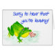 Een schattige groene kikker veegt zijn tranen af met een rode en witte gevlekte zakdoek omdat het triest is dat je weggaat. uit een waterverf van Judy Adamson. De binnenkant wordt verlaten leeg voor uw eigen bericht en andere kaarten en giften met kikkers zijn beschikbaar in mijn opslag.