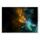 Vlucht van gloeiende, groene, artistiek getekende libel met doorzichtige groene en gele vleugels op gloeiende nachtelijke achtergrond met moeras planten en vuurvliegjes. Gloeiende libel.