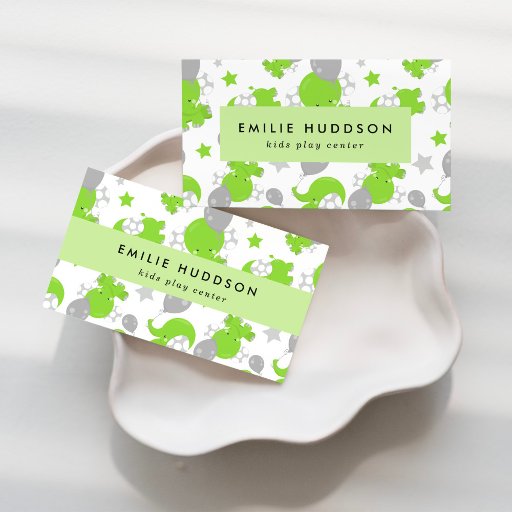 Schattigee, leuke en schattige visitekaartjes met groene olifanten, ballonnen en sterren. Modern en trendy design, perfect voor kinderspeelcentra, speeltuinen, activiteitencentra, kinderopvang, kinderopvang, babysitters en kindermeisjes.