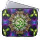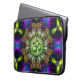 Spiritueel New age aanpasbare laptop of Notitieboek Sleeve: Fractal Geometric tapestry Patroon in prachtige paarse, groene, blauwe kleuren met een groen Om / Aum-symbool in het midden. Merk op dat dit specifieke sleeve een KLEINE FIT heeft en het beste geschikt is voor 14-inch laptops, laptops zoals mijn design en kunst.