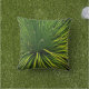 DIT BUITENKUSSEN HEEFT EEN INTERESSANTE HOEK DIE NEERKIJKT IN EEN GROEN SOTOL PLANT (DASYLIRION) PLANT MET ZIJN VERSCHILLENDE TINTEN GROEN. DE GEKARTELDE MESSEN MET TASELS OP DE TOPPEN, MORSEN OVER EN NEER OP DE GROND