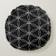 Ronde kussen met groot bloem des levens patroon. Dit elegante ontwerp in zwarte en zilveren kleuren behoort tot de heilige geometrie. Men gelooft dat het bloem des levens patroon genezing en harmonie brengt. Elk snijpunt van cirkels vormt de ster van David.